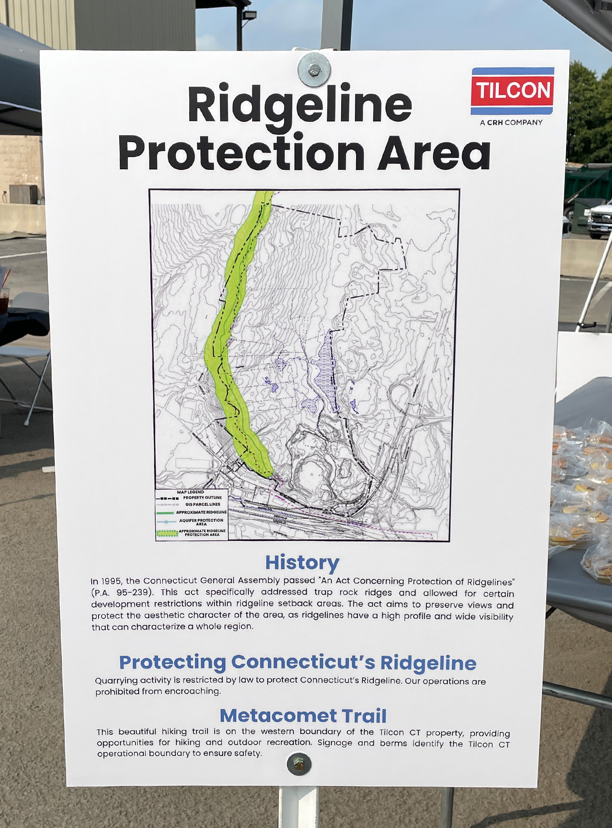In 1995, the Connecticut General Assembly passed “An Act Concerning Protection of Ridgelines” (P.A.95-239). This act specifically addresses basalt (also known as trap rock) ridges and allows for certain restrictions within Ridgeline setback areas. The act aims to preserve views and protect the aesthetic character of the area, as Ridgelines have a high profile and wide visibility that can characterize a whole region. Quarrying activity is restricted by law to protect Connecticut’s Ridgeline. Our operations are prohibited from encroaching.
