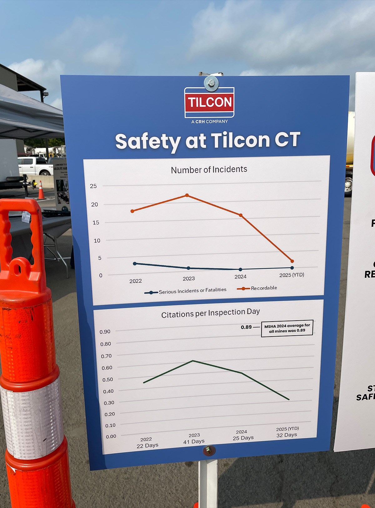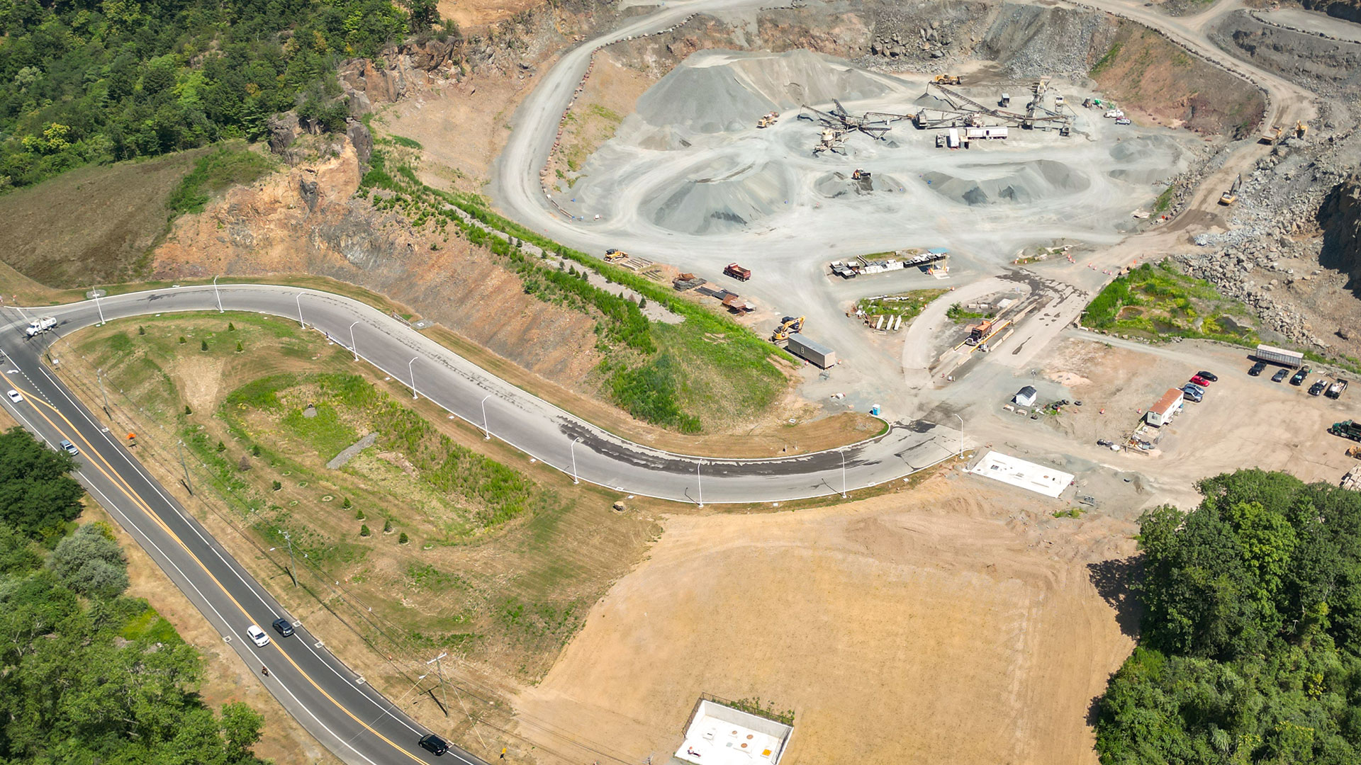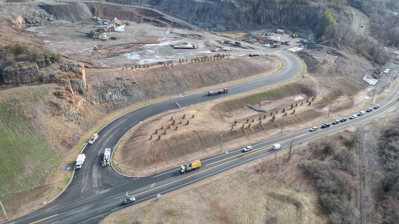 Over a two year period, we removed abandoned rail infrastructure, built berms to buffer the view of our operations and to safely manage traffic flow. In the fall of 2025, some plantings will be replaced, but overall, the vegetation is thriving on the new berm. Currently, a new Tilcon CT sign is being designed for this entrance.