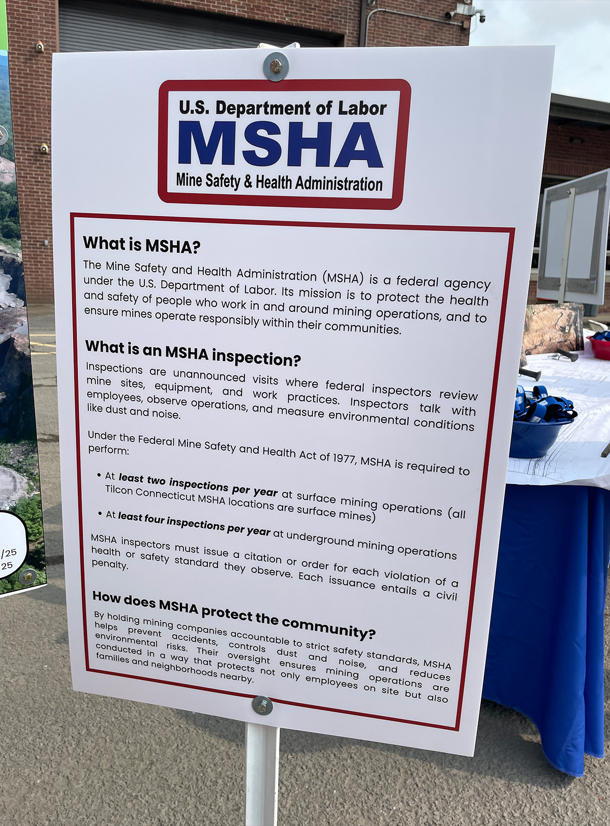 On a federal level, Tilcon CT is regulated by the Environmental Protection Agency (EPA), the Mine Safety & Health Administration (MSHA), the Occupational Health & Safety Administration (OSHA), and the Army Corp of Engineers. On a state level, Tilcon CT is regulated by the Connecticut Department of Energy and Environmental Protection (CT DEEP), Connecticut Department of Administrative Services (CT DAS), and the Office of the State Fire Marshal. On a local level, Tilcon CT is regulated by the Town of Plainville.
